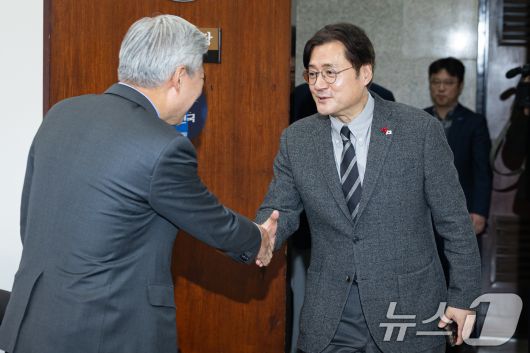 (서울=뉴스1) 유승관 기자 = 홍익표 청와대 정무수석이 22일 서울 여의도 국회에서 서왕진 조국혁신당 원내대표를 예방하고 있다. 2026.1.22/뉴스1