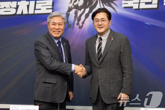 (서울=뉴스1) 유승관 기자 = 서왕진 조국혁신당 원내대표가 22일 서울 여의도 국회에서 홍익표 청와대 정무수석을 접견, 기념 촬영을 하고 있다. 2026.1.22/뉴스1fotogyoo@news1.krCopyright ⓒ 뉴스1. All rights reserved. 무단 전재 및 재배포, AI학습 이용 금지.