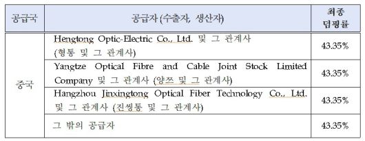 산업통상부 무역위원회(이하 무역위)가 중국산 단일모드 광섬유에 대해 40%가 넘는 고율의 반덤핑 관세 부과를 최종 결정했다. 또한 태국산 이음매 없는 동관에 대해서도 덤핑 혐의를 인정하고 잠정 관세 부과한다.