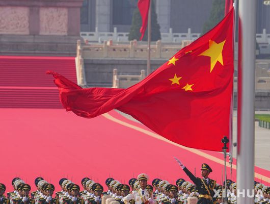 [베이징=신화/뉴시스] 3일(현지 시간) 중국 베이징 톈안먼(천안문)광장에서 열린 '중국 인민 항일 전쟁 및 세계 반파시스트 전쟁 승리(전승절)' 80주년 기념 열병식에서 중국 국기가 게양되고 있다. 2025.09.03. |