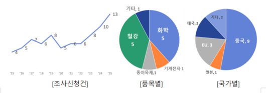 이에 따르면 지난해 덤핑조사 신청은 총 13건으로 집계됐다. 이는 1987년 무역위 출범 이후 최대 규모로, 덤핑 신청이 본격적으로 늘기 전인 2021년과 비교하면 두 배 이상 증가한 수준이다.