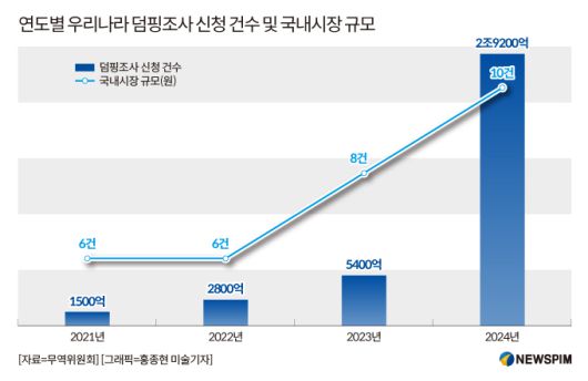 덤핑제품의 해당 국내시장 평균 규모는 지난해 1조 8000억원 규모로 2021년 1503억원에서 10배 이상 급증했다. 생산자・수입자・수요자 등 국내외 이해관계자 규모가 증가하고 있어 조사 복잡도와 난이도가 높아지고 있다.