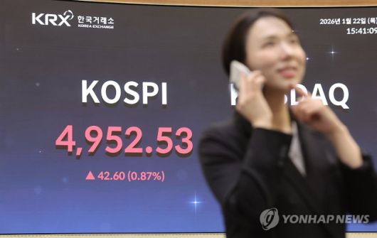 22일 한국거래소에 따르면 코스피는 전 거래일보다 42.60포인트(0.87%) 오른 4952.53에 거래를 마쳤다. 종가 기준 5000선 돌파에는 실패했지만 장중 5019.54까지 올라 새 역사를 썼다.
