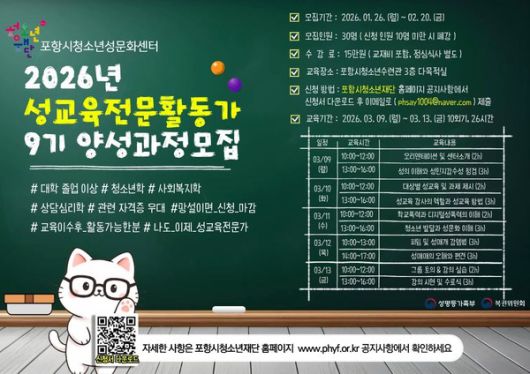 (포항=국제뉴스) 강동진 기자 = 포항시 청소년재단(대표이사 최제민) 청소년성문화센터는 오는 26일부터 내달 20일까지 청소년들의 건강한 성장을 돕고 올바른 성가치관을 전파할 '2026년 제9기 청소년 성교육 전문활동가 양성과정' 교육생 30명을 모집한다.
