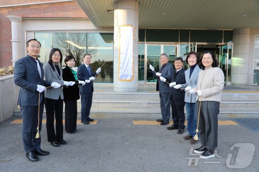 (대전=뉴스1) 박찬수 기자 = 이명구 관세청장(왼쪽에서 4번째)이 22일 충남 천안 소재 관세국경인재개발원(원장 유선희)에서 새로운 비전을 선포하는 현판 제막식을 하고 있다. (관세청 제공.재판매 및 DB금지)2026.1.22/뉴스1 인재원은 지난해 12월 ‘관세인재개발원’에서 ‘관세국경인재개발원’으로 명칭을 변경하고 새 비전으로 ‘관세국경을 수호하는 미래 융합인재 양성기관’을 정립한 바 있다. 2026.1.22/뉴스1