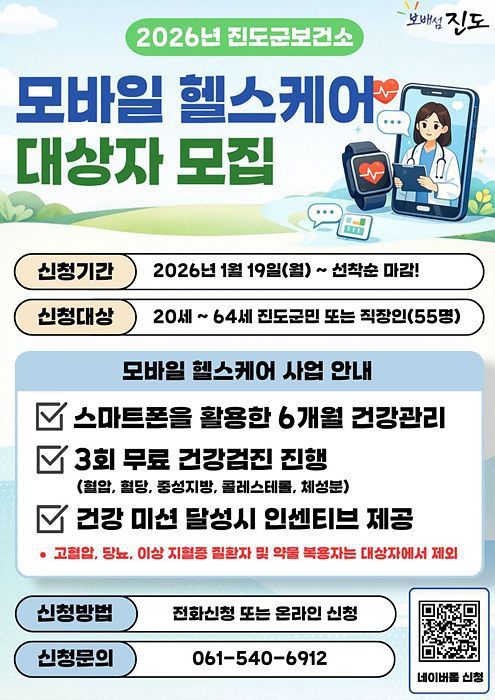 전남 진도군은 군민의 건강한 생활 습관 형성을 돕기 위해 '2026년 모바일 헬스케어 1기' 대상자 55명을 선착순으로 모집하고 있다고 밝혔다.