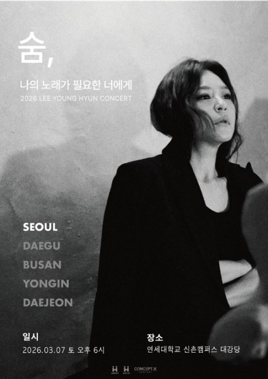 이영현은 오는 3월 7일 오후 서울 연세대학교 신촌캠퍼스 대강당에서 전국 투어 콘서트 '나의 노래가 필요한 너에게 - 숨' 서울 공연을 개최한다. 이번 공연은 서울을 시작으로 대구, 부산, 용인, 대전까지 5개 도시로 이어지는 투어의 서막이다.