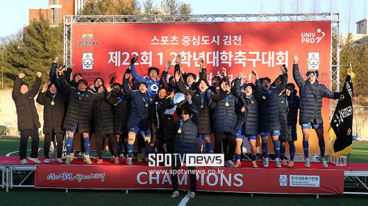 [스포티비뉴스=김천, 곽혜미 기자] 제22회 1,2학년 대학축구대회 중앙대와 상지대의 결승전이 22일 오후 경상북도 김천대학교 대운동장에서 열렸다. 4-3 극적인 승리를 거두며 우승을 차지한 중앙대 오해종 감독과 선수들이 세리머니를 하고 있다. <저작권자 ⓒ SPOTV NEWS. 무단전재 및 재배포 금지>