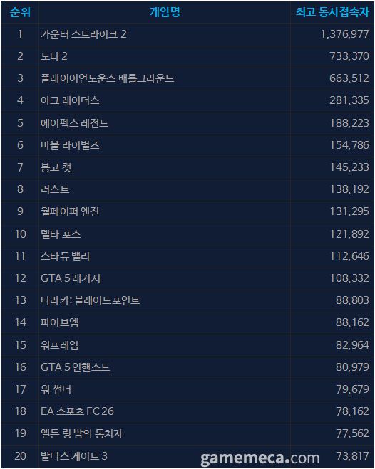 일 최고 동시접속자 TOP 20에서는 워프레임이 8만 2,964명으로 전일 대비 소폭 감소했다. 전반적으로 신규 콘텐츠 업데이트로 크게 증가했던 유저 수가 다시 업데이트 이전 수준으로 돌아갔다. 엘든 링 밤의 통치자는 7만 명대까지 감소해 19위로 하락했다.