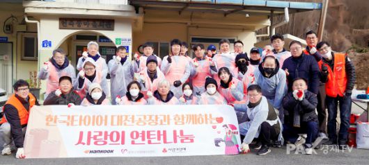 한국타이어앤테크놀로지는 최근 대전시 대덕구와 충청남도 금산군 일대에서 '사랑의 연탄 릴레이' 봉사활동을 전개했다고 밝혔다. 사진은 한국타이어 대전공장에서 사랑의 연탄 릴레이에서 참석자들이 기념촬영을 하고 있다. [사진제공=한국타이어][대전=팍스경제TV] 한국타이어앤테크놀로지㈜(이하 한국타이어)는 최근 대전시 대덕구와 충청남도 금산군 일대에서 '사랑의 연탄 릴레이' 봉사활동을 전개했다고 밝혔습니다.