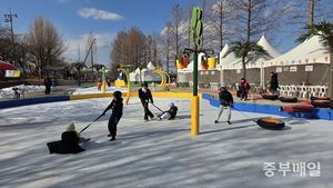 아이스패널 사용 기온 올라도 상태 유지나무썰매 대신 튜브… 안전한 체험 제공지난해 12월 개장 이후 3천886명 방문 무심천,얼음썰매장,어린이썰매장