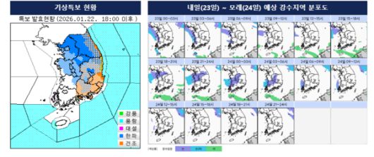 늦은 오후부터는 인천·경기서해안, 밤에는 서울, 경기남부내륙, 강원남부내륙과 산지, 충청권, 전북, 제주도에 다시 눈이 내릴 예정이다. 모레 새벽에는 충청권, 전라권, 경상서부내륙에서 눈이 이어지다 오전께 대부분 그치겠다. 예상 적설은 서해5도가 1cm~3cm, 서울·인천·경기서해안과 경기남부내륙이 1cm 미만, 강원남부내륙·산지가 1cm~3cm, 전남서부와 전북서해안, 제주도산지가 1cm~5cm, 광주와 전북내륙·제주도중산간 1cm 안팎이다.