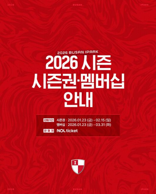 한편, 부산은 오는 23일(금)부터 시즌권·멤버십을 판매할 예정이며, 자세한 내용은 부산아이파크 공식 홈페이지와 놀(NOL) 티켓 홈페이지를 통해 확인할 수 있다.