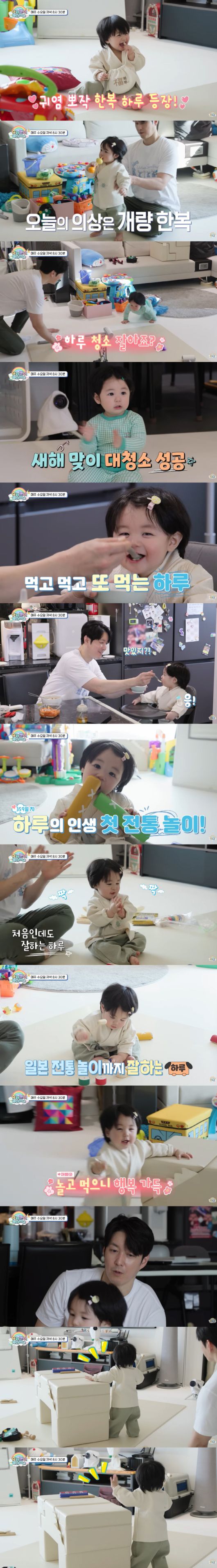 심형탁은 "하루와 첫 새해다. 활동을 많이 할 수 있게 준비해 봤다"면서 하루 군에게 장난감 청소기를 건넨 뒤 함께 청소 중인 아빠와 아들의 모습이 귀여움 가득하다.