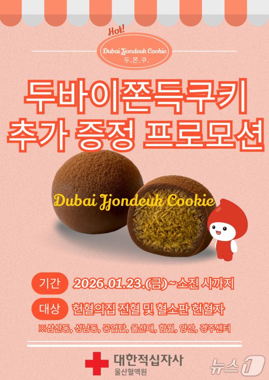 (울산=뉴스1) 박정현 기자 = 대한적십자사 울산혈액원이 23일부터 관할 헌혈의집에서 헌혈하는 시민에게 '두바이 쫀득 쿠키'(두쫀쿠)를 추가 증정한다고 22일 밝혔다.