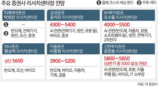 22일 세계일보가 국내 주요 증권사 6곳(미래에셋·삼성·NH투자·하나·키움·신한투자)의 리서치센터장을 대상으로 진행한 설문에서 올해 코스피 예상 밴드(등락 범위)는 ‘3900∼5850’으로 나타났다. 가장 높은 상단을 제시한 윤창용 신한투자증권 리서치센터장은 “시장의 낙관적 흐름이 이어질 경우 최고 5800~5850선까지의 ‘오버슈팅’도 충분히 가능할 것”이라며 “향후 시장은 실적 엔진인 반도체를 중심으로 인공지능(AI)이 실질적 비즈니스로 확장되는 커뮤니케이션 서비스와 소프트웨어가 바통을 이어받을 것”이라고 내다봤다.