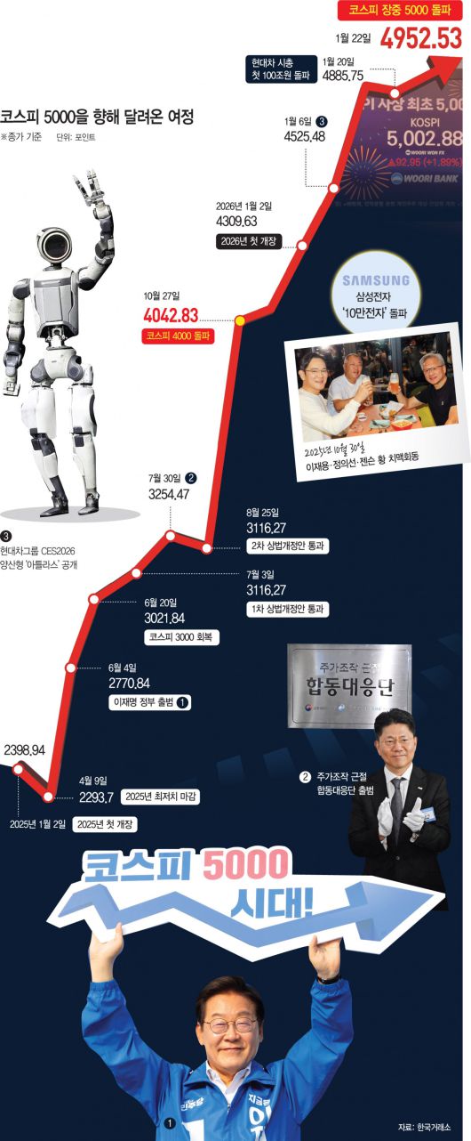 코스피 지수가 장중 5000을 돌파하며 국내 증시 역사를 새로 쓰고 있다. '코스피 5000시대' 달성은 지난해 4월, 당시 대선 후보였던 이재명 대통령이 내건 공약이었다. 이 대통령은 "코리아 디스카운트를 해소해 주가지수 5000시대를 열겠다"면서 주가 조작에 가담 시 패가망신한다는 것을 보여주겠다고 강조했다. 기울어진 운동장을 바로잡아 자본시장의 신뢰를 회복하겠다는 의지였다. 이후 코스피는 빠르게 상승세를 보였고, 공약한 지 약 9개월 만에 주가지수 5000시대를 여는 쾌거를 거뒀다.