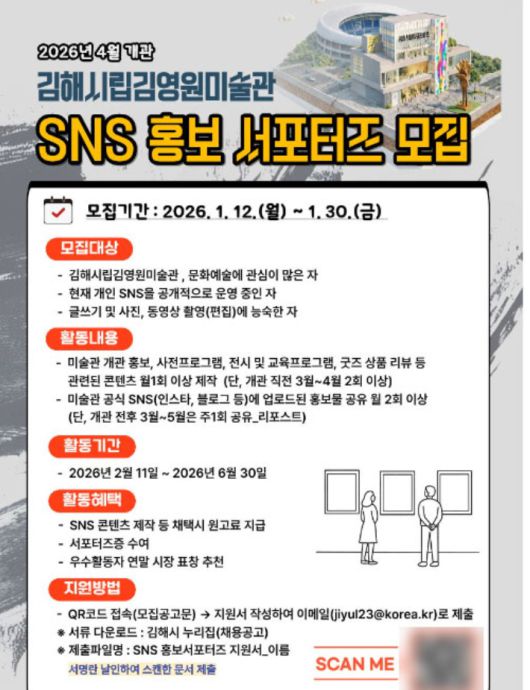 경남 김해시는 올해 4월 개관 예정인 '김해시립김영원미술관'을 알리고 기록할 'SNS 홍보 서포터즈'를 모집한다.