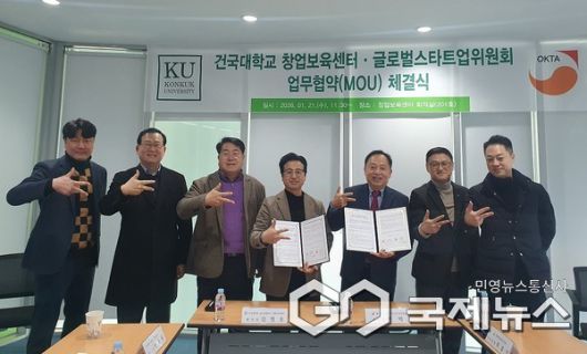 (충주=국제뉴스) 김상민 기자 = 건국대학교 글로컬캠퍼스 글로컬산학협력단(단장 전흥석) 창업보육센터(센터장 김정호)는 지난 21일 창업보육센터 회의실에서 월드옥타 글로벌스타트업위원회와 창업기업의 글로벌 경쟁력 강화를 위한 업무협약(MOU)을 체결했다.