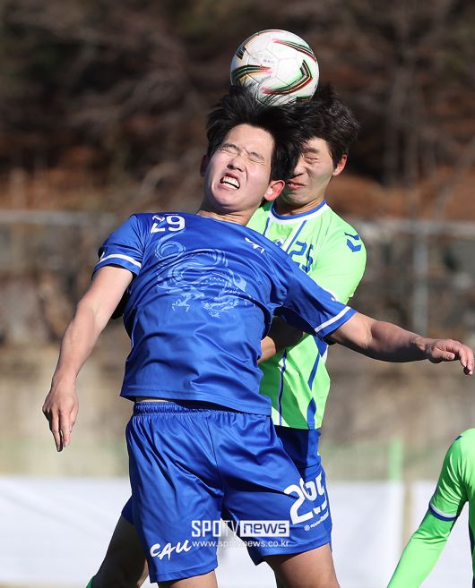 [스포티비뉴스=김천, 곽혜미 기자] 제22회 1,2학년 대학축구대회 중앙대와 상지대의 결승전이 22일 오후 경상북도 김천대학교 대운동장에서 열렸다. 중앙대 김동연과 상지대 강준모가 공중 볼 경합을 벌이고 있다. <저작권자 ⓒ SPOTV NEWS. 무단전재 및 재배포 금지>