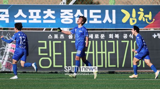 [스포티비뉴스=김천, 곽혜미 기자] 제22회 1,2학년 대학축구대회 중앙대와 상지대의 결승전이 22일 오후 경상북도 김천대학교 대운동장에서 열렸다. 중앙대 김수민이 후반전 골을 넣고 기뻐하고 있다. <저작권자 ⓒ SPOTV NEWS. 무단전재 및 재배포 금지>
