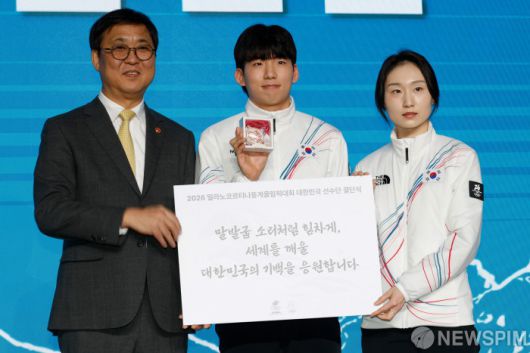 [서울=뉴스핌] 류기찬 기자 = 최휘영 문화체육관광부 장관이 22일 오후 서울 송파구 올림픽파크텔에서 열린 '2026 밀라노 동계올림픽 선수단 결단식'에서 선수대표인 스피드스케이팅 국가대표 정재원, 쇼트트랙 국가대표 최민정에게 선수단 격려보드를 전달한 뒤 기념촬영을 하고 있다. 2026.01.22 ryuchan0925@newspim.com |