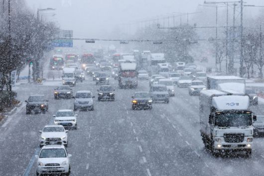지난 21일 오전 광주 서구 무진대로에서 차량들이 눈 속에서 서행하고 있다. /연합 |