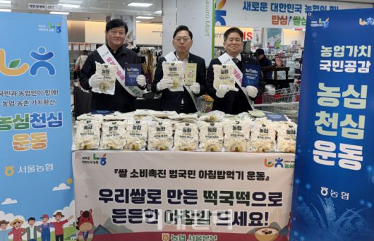 이날 곽병호(왼쪽부터) 농협유통 성내점장, 맹석인 총괄본부장, 변성환 은행본부장 등은 우리쌀로 만든 떡국떡과 함께 범농협 차원에서 추진 중인「농심천심(農心天心)운동」을 홍보하며, 농업·농촌과 우리 농산물의 가치를 알렸다.