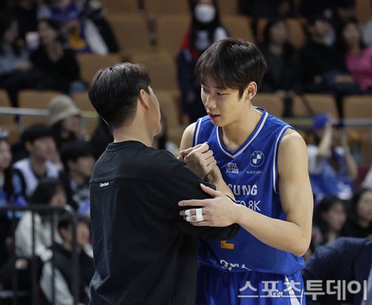 [스포츠투데이 권광일 기자] 2025-2026 LG전자 프로농구 서울삼성와 대구한국가스공사의 경기가 22일 서울 잠실실내체육관에서 열렸다. 삼성 이원석이 김효범 감독과 경기전 이야기를 하고 있다. 2026.01.22. [스포츠투데이 권광일 기자 sports@stoo.com]