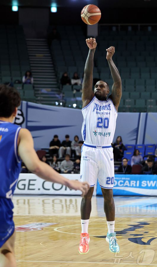 (서울=뉴스1) 김진환 기자 = 22일 오후 서울 송파구 잠실 잠실실내체육관에서 열린 2025-2026 LG전자 프로농구 정규리그 서울 삼성 썬더스와 대구 한국가스공사의 경기, 1쿼터 한국가스공사 라건아가 3점슛을 던지고 있다. 2026.1.22/뉴스1