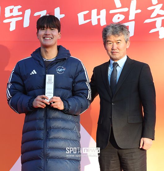 [스포티비뉴스=김천, 곽혜미 기자] 제22회 1,2학년 대학축구대회 중앙대와 상지대의 결승전이 22일 오후 경상북도 김천대학교 대운동장에서 열렸다. GK상을 수상한 중앙대 우규정이 대한축구협회 김승희 전무이사와 기념 촬영을 하고 있다. <저작권자 ⓒ SPOTV NEWS. 무단전재 및 재배포 금지>