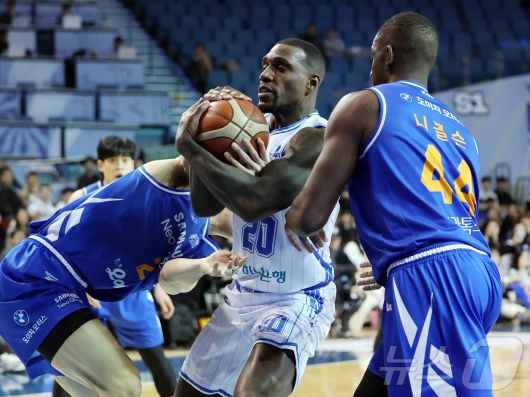 (서울=뉴스1) 김진환 기자 = 22일 오후 서울 송파구 잠실 잠실실내체육관에서 열린 2025-2026 LG전자 프로농구 정규리그 서울 삼성 썬더스와 대구 한국가스공사의 경기, 1쿼터 한국가스공사 라건아가 삼성 이원석, 니콜슨과 리바운드 경합을 하고 있다. 2026.1.22/뉴스1