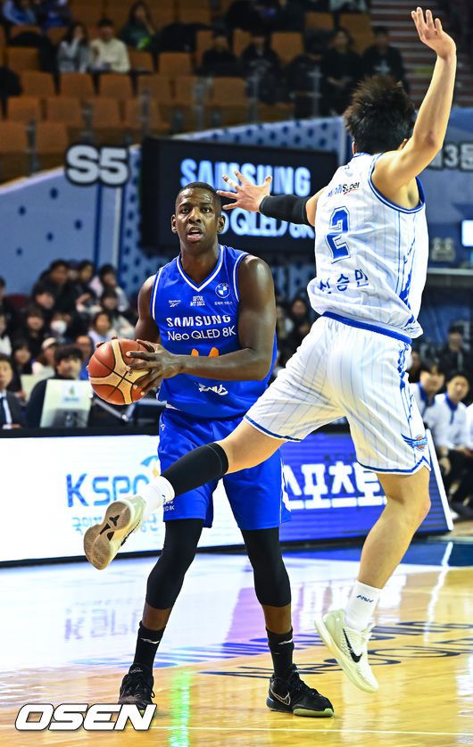1쿼터 삼성 니콜슨이 한국가스공사 신승민을 속이고 3점슛 준비하고 있다.. 2026.01.22 / soul1014@osen.co.kr