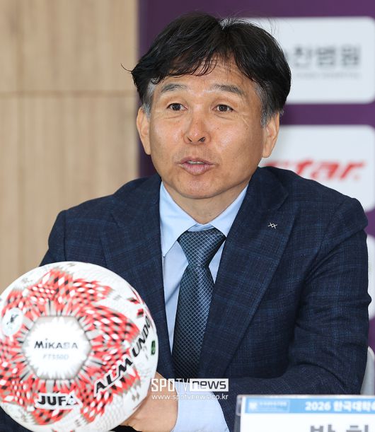 [스포티비뉴스=김천, 곽혜미 기자] 2026 한·일 대학축구연맹 덴소컵 협약식이 22일 오전 경상북도 김천시 종합스포츠타운 실내사격장에서 열렸다. UNIV PRO 상비군 전임감독 겸 중앙대 오해종 감독이 질문에 답하고 있다. <저작권자 ⓒ SPOTV NEWS. 무단전재 및 재배포 금지>