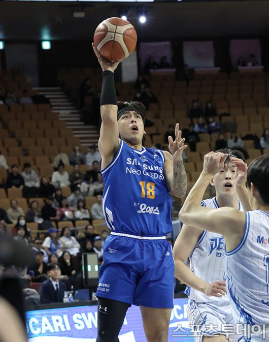 [스포츠투데이 권광일 기자] 2025-2026 LG전자 프로농구 서울삼성와 대구한국가스공사의 경기가 22일 서울 잠실실내체육관에서 열렸다. 삼성 저스틴 구탕이 골밑에서 슛을 시도하고 있다. 2026.01.22. [스포츠투데이 권광일 기자 sports@stoo.com]