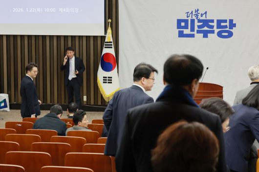 더불어민주당 국회의원들이 22일 국회에서 열린 중대범죄수사청·공소청 설치법 관련 정책 의원총회 회의장에 들어서고 있다. 연합뉴스 |