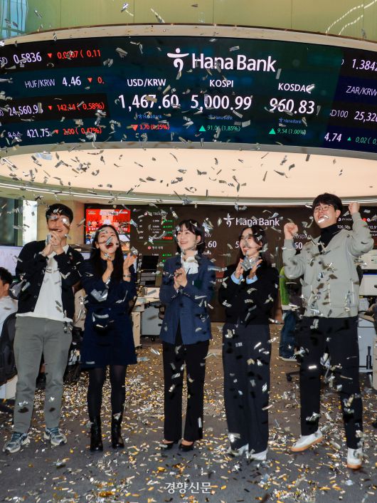 22일 오전 서울 중구 하나은행 본점 딜링룸에서 직원들이 장중 코스피 5000 돌파에 환호하고 있다. 이준헌 기자 |