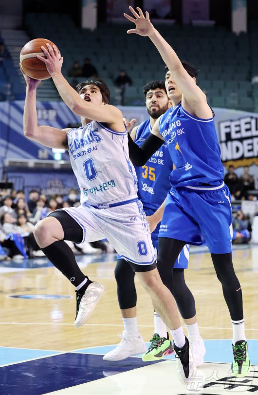 (서울=뉴스1) 김진환 기자 = 22일 오후 서울 송파구 잠실 잠실실내체육관에서 열린 2025-2026 LG전자 프로농구 정규리그 서울 삼성 썬더스와 대구 한국가스공사의 경기, 2쿼터 한국가스공사 벨란겔이 삼성 이관희의 수비 앞에서 레이업 슛을 하고 있다. 2026.1.22/뉴스1