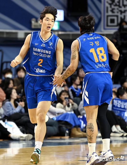(엑스포츠뉴스 잠실, 고아라 기자) 22일 오후 서울 송파구 잠실실내체육관에서 열린 2025-2026 LG전자 프로농구 서울 삼성과 대구 한국가스공사의 경기, 삼성 이원석 구탕이 득점한 뒤 기뻐하고 있다.고아라 기자 iknow@xportsnews.com