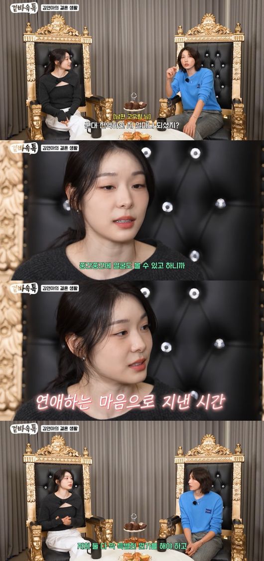 이날 김연경은 “결혼도 하셨잖아요. 잘 지내시는 거냐”라고 근황을 물었다. 김연아는 “무탈하고 잘 살고 있다”고 답했고, 김연경은 남편 고우림을 언급하며 “군대 전역하신 지 얼마나 되셨지?”라고 생각했다.