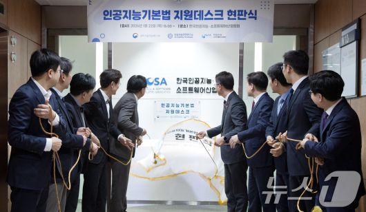(서울=뉴스1) 김명섭 기자 = 류제명 과학기술정보통신부 제2차관이 22일 오후 서울 송파구 한국인공지능소프트웨어산업협회(KOSA)에서 열린 '인공지능기본법 지원데스크 개소식' 에서 현판제막을 하고 있다. 왼쪽 네 번째부터 김명주 인공지능안전연구소장, 조준희 한국인공지능소프트웨어산업협회장, 류제명 제2차관, 손승현 한국정보통신기술협회장. (과학기술정보통신부 제공. 재판매 및 DB금지) 2026.1.22/뉴스1