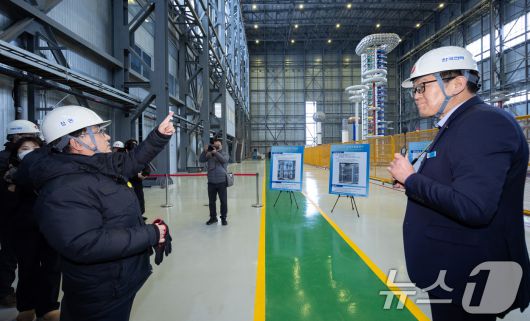 (서울=뉴스1) 김명섭 기자 = 김성환 기후에너지환경부장관이 22일 전북 고창군 소재 한국전력 고창전력시험센터를 방문하여 765kV 철탑, 고전압 및 저전압 직류케이블 실증시험장 등을 살펴보고 있다. (기후에너지환경부제공. 재판매 및 DB금지) 2026.1.22/뉴스1