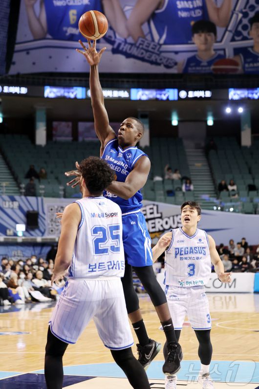 (서울=뉴스1) 김진환 기자 = 22일 오후 서울 송파구 잠실 잠실실내체육관에서 열린 2025-2026 LG전자 프로농구 정규리그 서울 삼성 썬더스와 대구 한국가스공사의 경기, 3쿼터 삼성 니콜슨이 훅슛을 던지고 있다. 2026.1.22/뉴스1kwangshinQQ@news1.krCopyright ⓒ 뉴스1. All rights reserved. 무단 전재 및 재배포, AI학습 이용 금지.