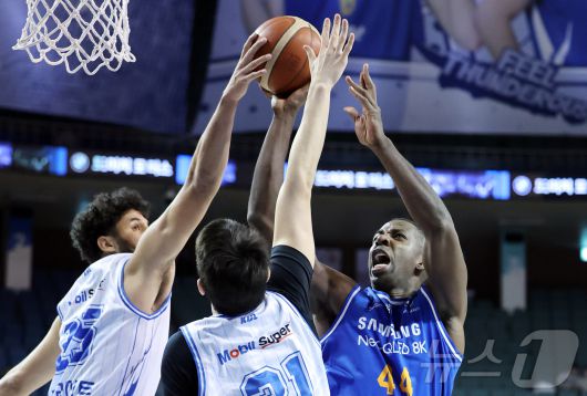 (서울=뉴스1) 김진환 기자 = 22일 오후 서울 송파구 잠실 잠실실내체육관에서 열린 2025-2026 LG전자 프로농구 정규리그 서울 삼성 썬더스와 대구 한국가스공사의 경기, 3쿼터 삼성 니콜슨이 골밑 공격 중 한국가스공사 보트라이트, 김준일의 수비에 막히고 있다. 2026.1.22/뉴스1