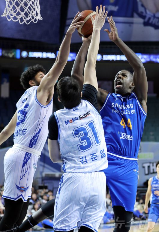 (서울=뉴스1) 김진환 기자 = 22일 오후 서울 송파구 잠실 잠실실내체육관에서 열린 2025-2026 LG전자 프로농구 정규리그 서울 삼성 썬더스와 대구 한국가스공사의 경기, 3쿼터 삼성 니콜슨이 골밑 공격 중 한국가스공사 보트라이트, 김준일의 수비에 막히고 있다. 2026.1.22/뉴스1