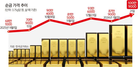 22일 한국금거래소에 따르면 전일 기준 순금 1돈(3.75g) 매입가격은 100만9000원으로 100만원대를 넘어섰다. 지난해 초 한 돈당 53만원 수준이던 가격은 3월 60만원대, 7월 70만원대에 이어 10월 90만원을 돌파하며 최고가를 경신해왔다. 지난해 같은 기간 대비 90% 가까이 뛰는 급등 추세가 1년 내내 지속됐다.