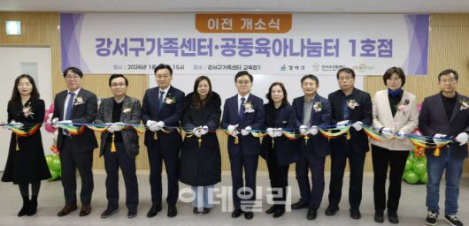 [이데일리 김태형 기자] 진교훈(가운데) 강서구청장이 22일 강서구가족센터와 공동육아나눔터 1호점 개소식에서 참석자들과 테이프커팅을 하고 있다.