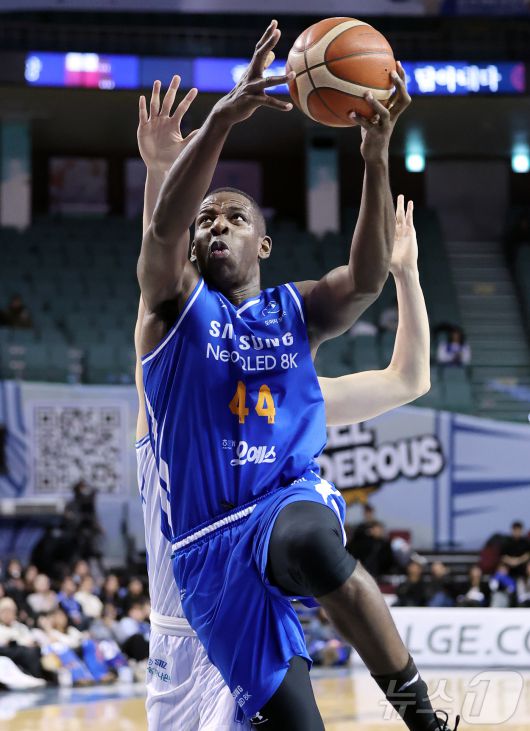 (서울=뉴스1) 김진환 기자 = 22일 오후 서울 송파구 잠실 잠실실내체육관에서 열린 2025-2026 LG전자 프로농구 정규리그 서울 삼성 썬더스와 대구 한국가스공사의 경기, 3쿼터 삼성 니콜슨이 골밑으로 돌파하고 있다. 2026.1.22/뉴스1