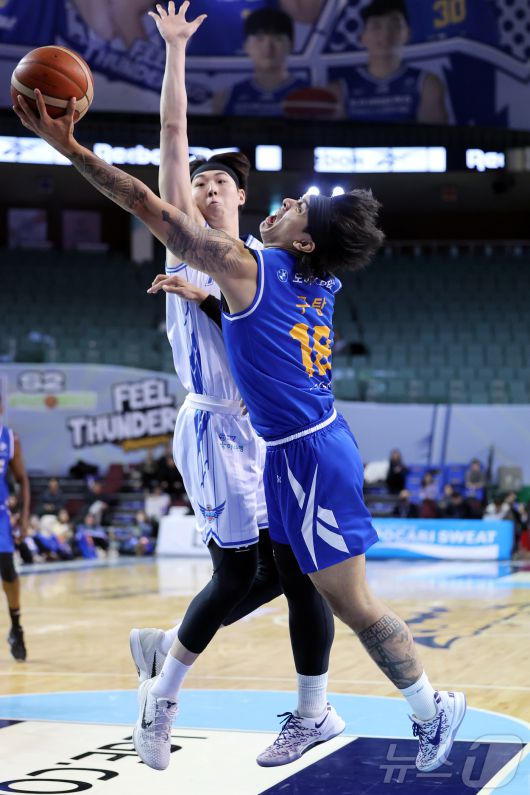 (서울=뉴스1) 김진환 기자 = 22일 오후 서울 송파구 잠실 잠실실내체육관에서 열린 2025-2026 LG전자 프로농구 정규리그 서울 삼성 썬더스와 대구 한국가스공사의 경기, 3쿼터 삼성 구탕이 골밑으로 돌파하고 있다. 2026.1.22/뉴스1
