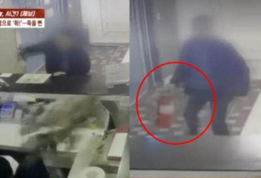 손님의 범행은 매장 안 CCTV에 고스란히 녹화됐다. 손님이 던진 소화기가 A씨 머리 옆을 아슬아슬하게 비껴가는 장면도 포착됐다.